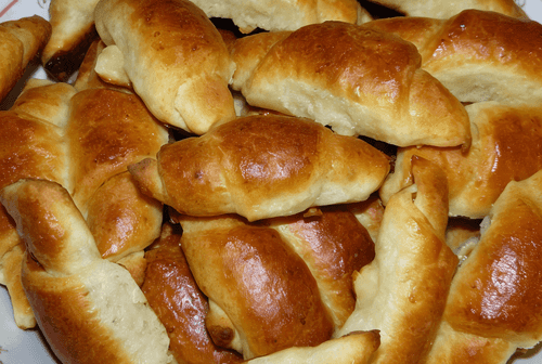 Вынуть из холодильника тесто, сначала 4 куска. Кусок помять в руках (чтобы подогрелся) и раскатать в виде тонкого блина, как на лапшу (чем тоньше — тем лучше!). Блин разрезать на 8 сегментов (как колесо) — получилось 8 треугольников. На край основания треугольника положить начинку, соединить широкие концы (концы основания), а потом скатать к узкому краю, вытягивая узкий край, как рогалик.