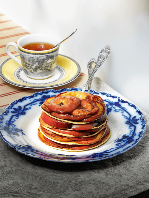 Карамелизованные яблоки выложить слоем на блин, сверху положить следующий, на него снова яблоки — и повторять, пока не закончатся блины. Верхним слоем выложить яблочные попки, тоже карамелизованные.