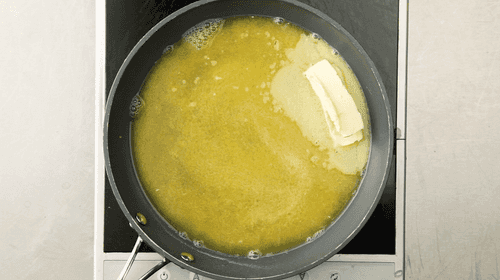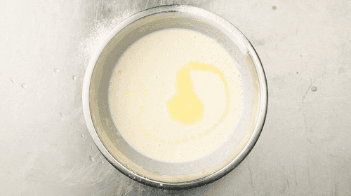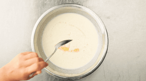 Полученную смесь влить в муку, перемешать, добавить тонкой струйкой пол столовой ложки растопленного сливочного масла. Затем тесто должно постоять пару часов при комнатной температуре. Непосредственно перед жаркой развести его газированной водой (50–70 мл) до наиболее приемлемой консистенции.