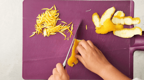 Срезать цедру с одного апельсина. Из всех выжать сок. Цедру нарезать тонкой соломкой.