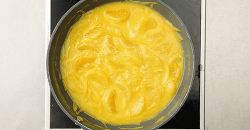 Оставшийся апельсиновый сок влить в глубокую сковороду, добавить оставшиеся сливочное масло и сахар и столовую ложку ликера. Нагреть на очень слабом огне, добавить цедру и готовить четверть часа, постоянно помешивая. Выложить в соус разобранные на дольки мандарины. Покачивая сковороду, нагреть дольки. Выложить их на отдельную тарелку.