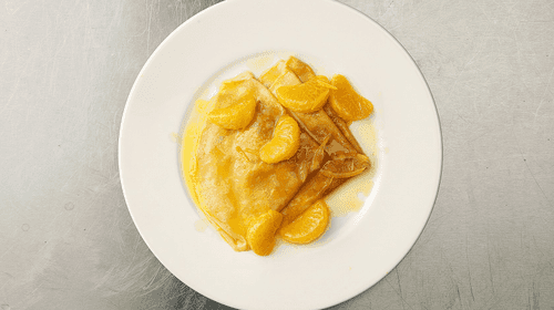 На подогретые тарелки выложить блинчики (по два на порцию), украсить дольками мандарина. В сковороду добавить оставшийся ликер, перемешать и полить этим соусом блинчики и мандариновые дольки.