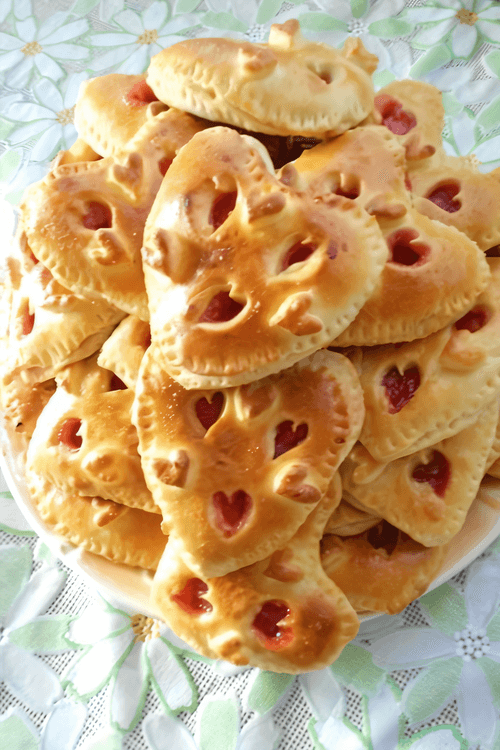 Вырезала сердца, намазала вареньем, сверху — второе сердце с окошками, смазывала яйцом и сверху крепила те маленькие сердечки, что вырезали из окошек.
