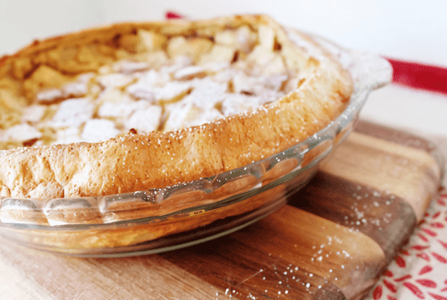 Возьмите сковороду из духовки и добавьте оставшееся масло; покрутите, чтобы покрыть дно сковороды. Равномерно уложите кусочки яблок на дно. Вылейте тесто на яблоки. Выпекайте в духовке 25 до 30 минут, пока не подрумянится.