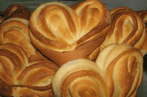 Разделить тесто на комочки размером поменьше мандарина. Каждый раскатать в прямоугольник, смазать маслом, посыпать сахаром, свернуть в рулетик. Соединить концы вместе, сделать не до конца надрез и вывернуть. Получится плюшка.