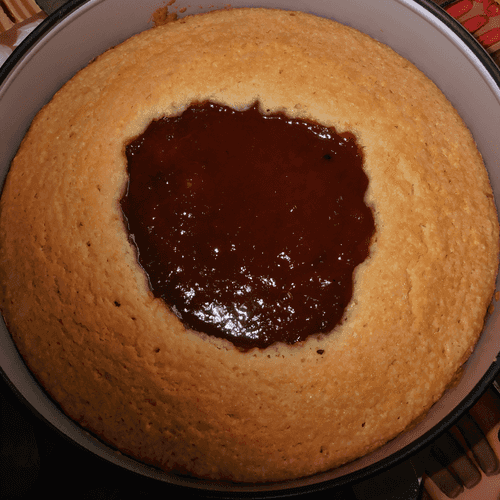 Выложить джем в миску и перемешать до однородной мягкой консистенции. Добавить сок лимона, если джем слишком сладкий. Разровнять по форме в ямке, оставляя края по кругу чистыми.