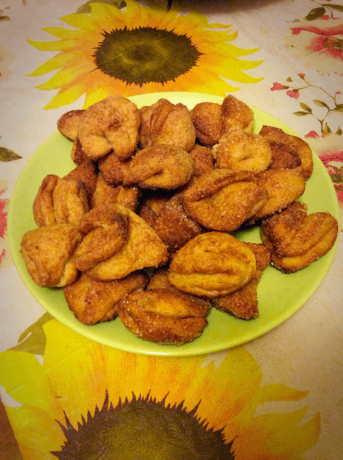 На тарелку насыпать сахар и корицу, перемешать. Обвалять кружок в сахаре, свернуть пополам, сахарной стороной вовнутрь.