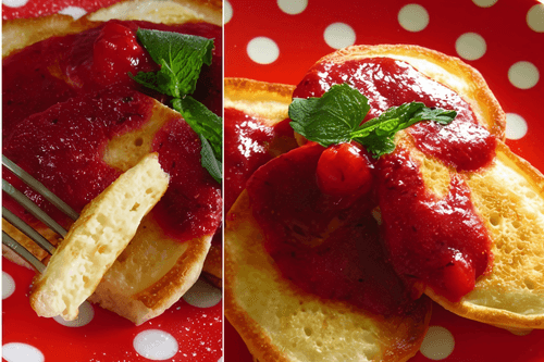 Оладьи с клубнично-мятным соусом — это нежное лакомство, объединяющее мягкость традиционных русских оладьев с освежающей ягодно-травяной ноткой. Они берут свое начало в русской кухне, где домашняя выпечка всегда была частью уютных семейных завтраков. Пышные, воздушные, с легким ванильным ароматом, эти оладьи тают во рту, а их вкус прекрасно дополняет ароматный клубничный соус с мятой, который дарит ощущение свежести. Идеально подходят как для утреннего угощения, так и для легкого десерта в любое время дня. Благодаря кисломолочному тесту они сохраняют особую структуру, а жарка на небольшом огне делает их особенно нежными. Украшенные листочком мяты, они не только радуют вкус, но и выглядят как настоящий кулинарный шедевр.