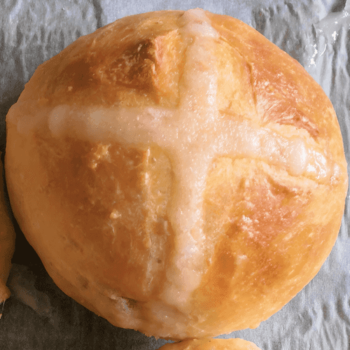 Растворить сахарную пудру с одной столовой ложкой молока. С помощью кондитерского мешка нанести на поверхность готовых булочек форму креста и оставить высыхать на 30–40 минут (перед тем, как наносить узор, булочки должны остыть, иначе сахарная глазурь стечет).