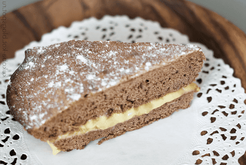 Разрезать пирог на 2 пышки и намазать нижнюю кремом, немного не доходя до краев, накрыть верхней и отправить на пару часов (а лучше на дольше) в холодильник, пока крем на застынет.