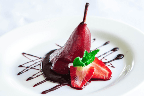 Груша в соусе Убриако — элегантный десерт югославской кухни, вдохновленный традицией приготовления фруктов в вине. Название «Убриако» в переводе означает «пьяная», отражая основную кулинарную технику этого блюда. Груши сорта «Конференц» медленно томятся в ароматном красном сухом вине с корицей, гвоздикой и лимонной цедрой, наполняясь насыщенным вкусом специй и терпким винным букетом. Готовый соус, загущенный до шелковистой текстуры, обволакивает сочные плоды, подчеркивая их нежность. Завершает композицию легкость взбитых сливок, свежесть клубники и мята, добавляя гармонию вкуса. Этот десерт идеально подходит как утончённое завершение трапезы, особенно в сочетании с чашкой ароматного чая или бокалом сладкого вина.