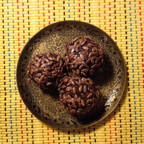 Из застывшей массы накатать шарики, либо придать любую другую излюбленную форму. Получившиеся порционные сладости обвалять или обсыпать цельными семечками льна для красоты.