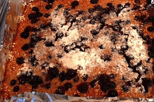 Достаем бананы с ягодой из духовки. Убираем фольгу и посыпаем овсяной смесью. Затем выливаем смесь из молока на хлопья, убедившись, что смесь распределилась равномерно. Посыпаем оставшейся ягодой (по желанию, можно добавить еще и орехи).