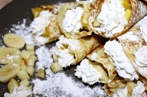 Затем мелко порезать фрукты (любые по вашему желанию), завернуть в вафли, добавить взбитые сливки.