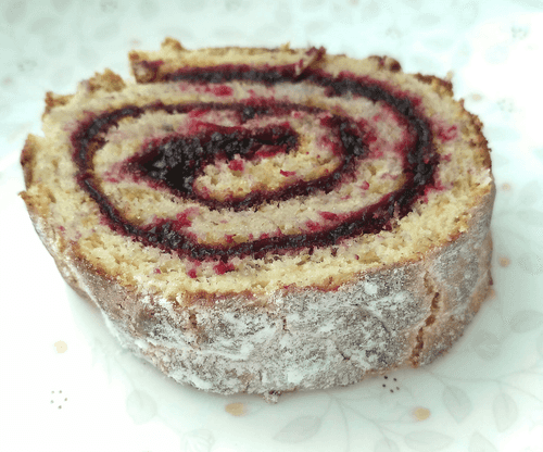 Готовый бисквит вынуть из духовки, выложить на салфетку (полотенце), перевернув противень (я кладу полотенце на противень, сверху кладу разделочную доску и, придерживая, переворачиваю противень); снять быстро бумагу, смазать джемом и быстро закрутить в рулет, как можно плотнее; посыпать сахарной пудрой и оставить остывать.