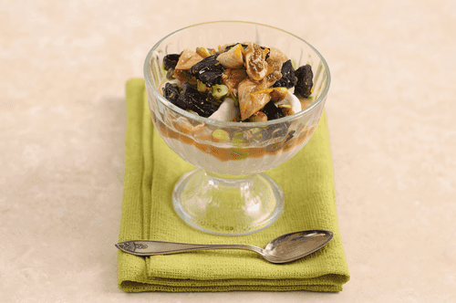 Выложите инжир и чернослив с орехами на крем и подавайте холодным.