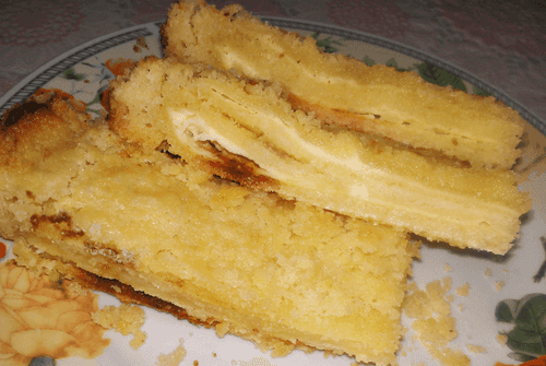 Берем форму для выпечки (у меня прямоугольной формы). Все выкладываем слоями: первый слой — насыпное тесто, затем выкладываем творожную массу, снова — тесто, массу и последний слой теста. Далее нарезаем сливочное масло, равномерно по всей поверхности пирога.