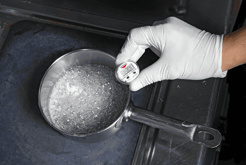 Сварить сироп — 100 грамм сахара поместить в сотейник, залить водой и поставить на средний огонь. Тут понадобится термометр: когда смесь начнет кипеть, нужно проверить ее температуру — как только она достигнет 112 градусов, сироп можно убирать с плиты.