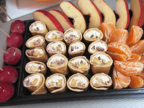 Примерно на 1/3 от края блина выложить полоской творожную массу. Рядом уложить фрукты и свернуть блин плотным рулетом. Таким же образом сделать рулеты из оставшихся блинов и начинки, после чего убрать их в холодильник на 1 час.