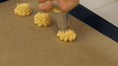 Разогреть духовку до 150 градусов. Противень застелить бумагой для выпекания. Наполнить тестом кондитерский рожок с насадкой в виде звездочки. Выдавить на противень тесто в форме закрученной спирали и отправить в духовку на 10-20 минут, пока печенье не подрумянится. Остудить и подавать.