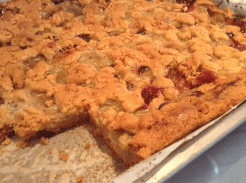 Сливочное масло нарезать кубиками, добавить самоподнимающуюся муку, молотый миндаль, сахар и с помощью ручного блендера превратить полученную массу в крупную крошку. Пару ложек оставить для верхнего слоя, остальное отправить на противень и слегка прижать.