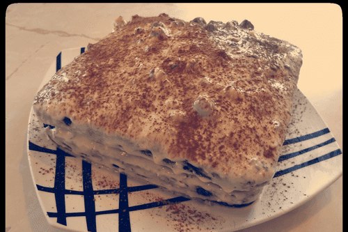 На нижний корж выкладываем 2/3 крема, разравниваем, накрываем вторым коржом и смазываем оставшимся кремом. Сверху можно украсить какао или тертым шоколадом.