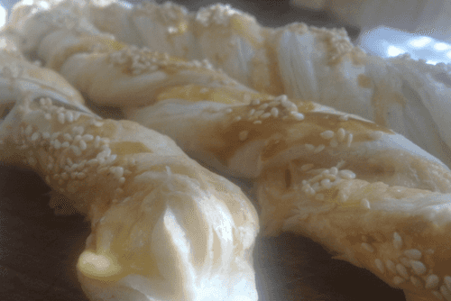 Растаявшее слоеное тесто слегка раскатываем на присыпанном мукой столе. Нарезаем длинные полоски шириной 2 см. Полосок должно быть четное количество.