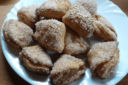 В отдельно насыпанную неглубокую тарелку насыпать сахар. Положить этот кружочек и надавить ладошкой, чтобы сахар прилип. Сложить этот кружок напополам, сахаром внутрь. Снова прижать к сахару. Затем снова так же сложить сахарной стороной внутрь. Одну часть прижать к сахару, а другую сторону в муке, чтобы не пригорела.