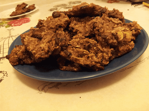 Смазать бумагу для выпечки маслом, уложить на противень и выложить на нее небольшими порциями получившуюся смесь. Выпекать 15 минут в предварительно разогретой до 250 градусов духовке.