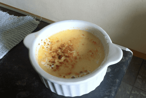 Перед подачей посыпьте формочку сверху сахарной пудрой равномерным тонким слоем; используя газовую горелку, создайте карамельную корочку.
