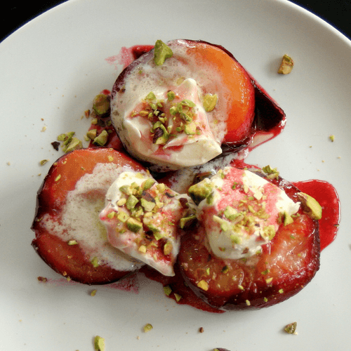 Запеченные сливы с мороженым – это истинное воплощение европейской элегантности в десертах. В этом блюде гармонично сочетаются сладость фруктов, глубокий винный аромат и теплая пряность специй. Сливы, пропитанные красным вином, приобретают насыщенный вкус и нежную текстуру, а специи придают соусу богатую, согревающую нотку. Запеченные до мягкости, они раскрывают весь свой природный сахар, который идеально дополняется охлаждающей легкостью ванильного мороженого. Это блюдо прекрасно подходит для завершения уютного ужина, добавляя изысканность и теплоту. Его можно подавать как самостоятельный десерт или с легким миндальным печеньем. Изысканный вкус и аромат напоминают классические французские или итальянские десерты, предлагая наслаждение каждым кусочком.