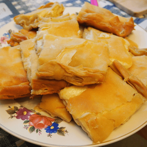 Выкладываем 3 отваренных пласта в противень, поливая каждый маслом. Сверху выложите половину сырной начинки и аккуратно распределите по всей площади. Снова 3 пласта отваренного теста, каждый смазанный маслом, и оставшуюся начинку.