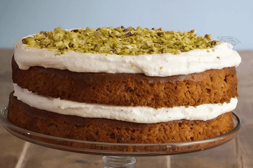 Фисташки (200 г) крупно порубить. Взбить сахарную пудру (120 г), измельченные фисташки (60 г) и миндаль (60) , яйца. Масса должна увеличиться в 2 раза. Отдельно взбить белки (3 шт) до мягкости, добавьте сахар (15 г) и взбить до плотности. Просеять муку и добавить. Сливочное масло растопить и добавить (постепенно), перемешать. Распределите тесто по форме, выстеленной бумагой. Выпекать в разогретой до 220 градусов 8–10 минут. На чистый противень высыпать рубленные фисташки. Готовый бисквит перевернуть на фисташки и оставить до остывания, аккуратно перевернуть. Вырежьте равные по высоте полоски. На дно формы выложите первый корж. Борта проложите полосками бисквита.