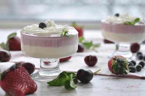 В стаканы выложить белый йогурт, сверху выложить йогурт с черникой, украсить взбитыми сливками и ягодами черники.