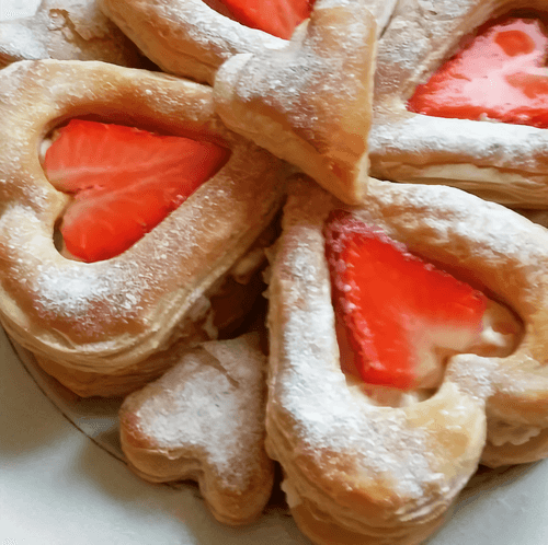 Раскатать 2 пласта готового слоеного теста, сложить каждый пласт пополам и вырезать форму (я выбрала сердце). Получится 4 сердечка. В 2 кусочках вырезать маленькие сердечки посередине. Отправить тесто в разогретую до 200 градусов духовку на 20 минут.