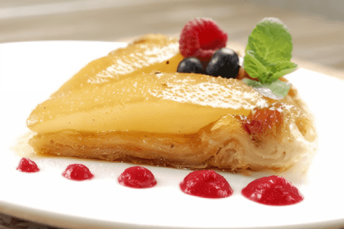 Пирог из слоеного теста с грушами – это изысканный десерт европейской кухни, сочетающий воздушную хрустящую корочку и нежные карамелизированные груши. Его происхождение связано с традиционной французской выпечкой, где карамелизированные фрукты и слоеное тесто создают утонченную гармонию вкусов. Карамельный сироп с оттенками кардамона придает пирогу теплые пряные нотки, а ягоды и мята – свежесть и элегантность. Этот пирог идеально подходит для уютных семейных чаепитий или торжественных ужинов, когда хочется чего-то особенного. Подают его слегка теплым, дополняя ягодным джемом, что делает десерт еще более насыщенным и выразительным.