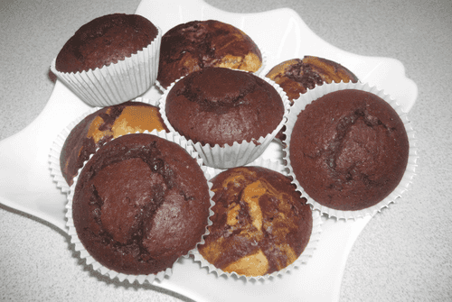 Для приготовления теста отдельно смешать смеси для приготовления классических и шоколадных маффинов с молоком, растительным маслом, яйцом и вымесить до однородного состояния в соответствии с инструкцией на упаковках. На противне разложить 24 бумажные корзиночки.