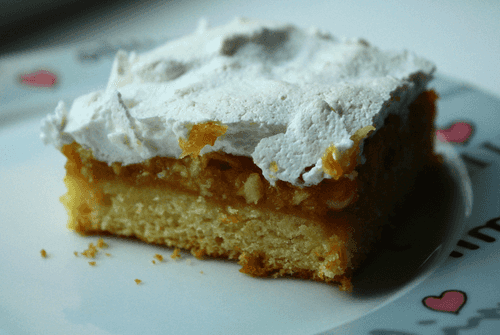 Пока пирог в духовке, сделать безе: взбить 3 белка со стаканом сахара до мягких пиков, примерно минут 5. С безе печь еще минут 5.