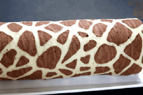 Рецепт теста для рулета взяла обычный бисквитный, вы можете приготовить по своему любимому рецепту. Противень у меня маленький (20х30 см), т. к. духовка у меня маленькая, поэтому у меня получается из этой порции один рулетик, как на фото, и один маленький. Если у вас противень большего размера, то и рулетик будет выглядеть намного симпатичнее. Сначала берем пергамент размера нашей формы для выпечки и рисуем простым карандашом рисунок жирафа жирными линиями.