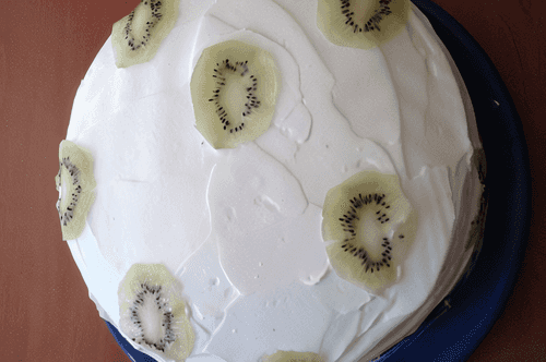 Смазать взбитыми сливками каждый слой и проложить нарезанными на тонкие кружки фруктами. Получившуюся стопку коржей и начинки снаружи обмазать взбитыми сливками. Украсить торт на свой вкус.