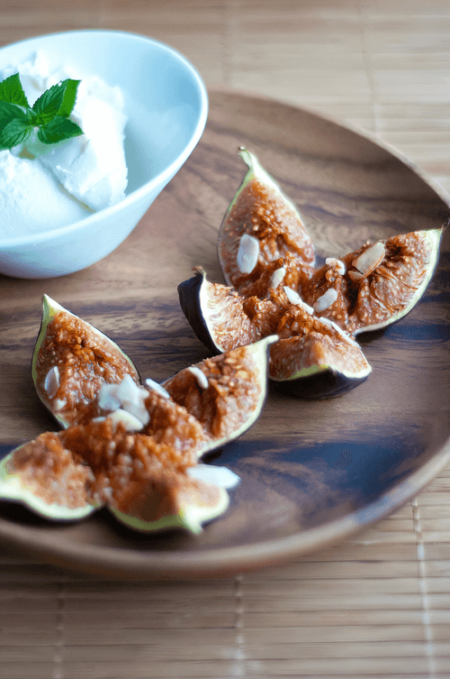 Глубоко надрезать инжир крест накрест и раскрыть его. Полить каждый ложкой меда, положить по кусочку масла и посыпать корицей по вкусу и крошеным миндалем, или лепестками миндаля, как у меня.