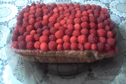 После того, как бисквит остынет, разрезать его на 2 части и смазать джемом. Верх также смазать джемом и выложить свежую малину.