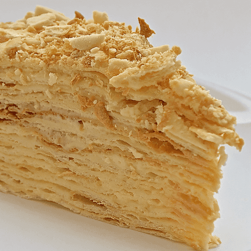 Торт «Наполеон» из рубленого теста с заварным кремом — настоящий шедевр европейской кухни, известный своей многослойной текстурой и нежным сливочным вкусом. История этого десерта восходит к временам Наполеона Бонапарта, когда подобные слоёные изделия символизировали триумф и изысканность. Хрустящие коржи, приготовленные из рубленого теста, идеально сочетаются с бархатистым заварным кремом, создавая гармоничное сочетание легкости и насыщенности. Этот торт поражает своей способностью впитывать крем, становясь особенно мягким и тающим во рту после нескольких часов пропитки. Наполеон часто украшают крошкой из обрезков коржей, что добавляет десерту дополнительную текстурную изюминку. Идеален для торжественных мероприятий и уютных семейных вечеров, он остаётся неизменным символом праздника и удовольствия.