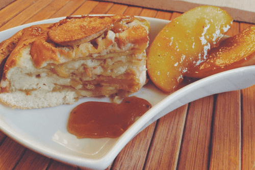 Для украшения я использовала карамелизированные яблоки. Делаются они очень быстро и легко. Нарежьте яблоки дольками. На сковородке растопите сливочное масло. Выложите дольки яблок на сковородку. Обжаривать яблоки нужно до румяного вида (яблоки должны быть мягкими). Затем добавить к яблокам сахар и помешивать до тех пор, пока каждая долька не покроется карамелью.