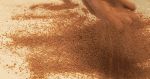 Растопленное масло намазать на пласт. Посыпать пласт смесью корицы и тростникового сахара. Скатать пласт в тугой рулет (чем туже, тем лучше).