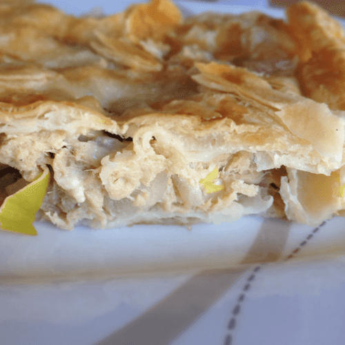 Слоеный пирог с тунцом, луком-пореем и солеными огурцами