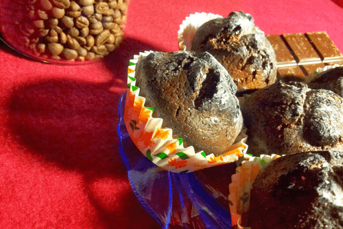 Разложите смесь в формы для маффинов (я пекла в силиконовых) на 2/3 по высоте и в центр каждого маффина погрузите половинку квадратика отложенного шоколада (если дольки маленькие, то целиком).