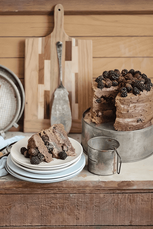 На первый и второй корж нанесите крем, сверху выложите вымытую высушенную ежевику. Нанесите остальной крем по всей поверхности снаружи торта. Украсьте ягодами и подавайте.