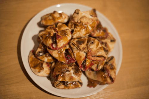 Свернуть тесто в конвертики. Каждый конвертик смазать яйцом.