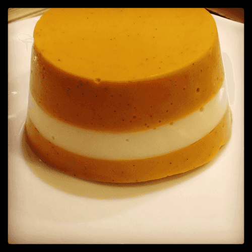 Выпарите в сотейнике оставшийся ром до 20 грамм. Смешайте в стакане погружным блендером 200 грамм молока и 150 грамм морковного пюре, в конце добавьте смесь сахара, ванили, соли и соды. Замочите 2 листа желатина. Нагрейте полученную морковно-молочную массу и растворите в ней желатин. Отложите в сторону.